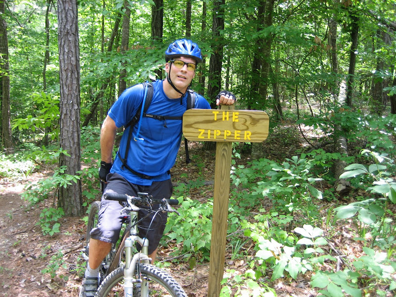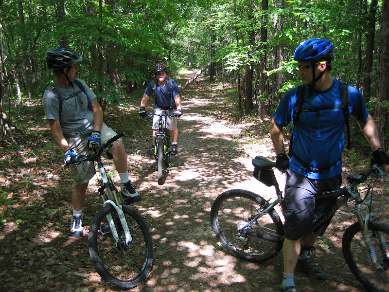 on around and came out on the power line trail. I think Scott and Shane were not liking our pace, so we decided to split up. We continued on around and it was a nice ride until we got to the back corner near the swayback bridge. I don’t know what happened, but this section wiped me out a lot more than usual. I think the humidity was affecting me a lot. We finished on up and sat in the parking lot talking to the group from Pensicola while eating a snack and refilling our camelbacks. We headed out to ride the black trail backwards this time. We figured we would run into Scott and Shane this way to make sure they were ok. This first section had the most elevation